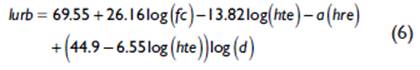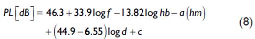 Where fc (MHz) is the operating frequency, hte (m) is the height of the transmitting antenna, d is the distance between the base station and the mobile station, and a(h re ) is the correction factor of the receiving antenna. The calculation of this factor depends on the density of the environment and is calculated with (7):