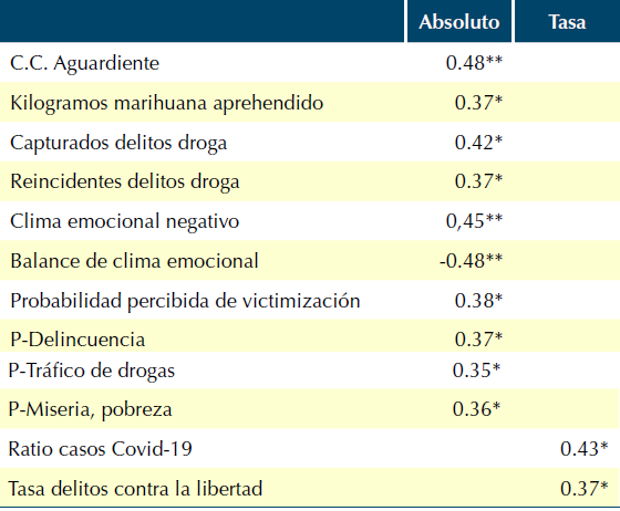 Las cifras sobre comportamientos contrarios a la convivencia están disponibles en frecuencias absolutas y en tasas relativas a los datos poblaciones de cada departamento. En cuanto a las primeras, las cifras absolutas, se hallan correlaciones significativas entre casi todos los CCC, lo cual puede estar determinado por el tamaño de la población de cada región y de Bogotá. Por ello, en el presente trabajo se ha considerado también las tasas relativas, que ofrecen unos resultados más conservadores en cuanto al tamaño de los coeficientes de correlación, pero también más consistentes con los constructos teóricos y con el comportamiento de los principios de contagio por Covid-19, como se expone a continuación.