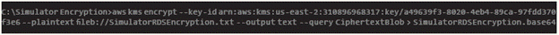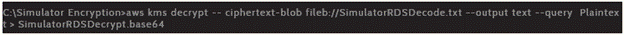 Se corre el comando que se ve en la figura 7 para decodificarlo, donde "SimulatorRDSDecrypt. base64" es el archivo anteriormente decodificado y "SimulatorRDSDecrypt.txt" el archivo resultante desencriptado, para finalizar se obtiene la información que se encriptó y cifró por medio de KMS.