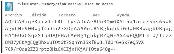 Para proceder con la encriptación del archivo se realiza el siguiente comando, donde "Simulato-rRDSEncryption.txt" es el archivo inicial y "Simula-torRDSEncryption.Base64" es el archivo resultante.