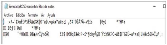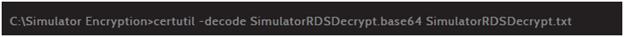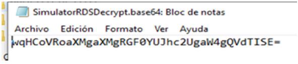 Para desencriptar el archivo se corre el comando que a continuación se presenta (Figura 5) donde "Si-mulatorRDSDecode.txt" es el archivo que se intenta decodificar y "SimulatorRDSDecrypt.base64" es el archivo resultante. En el archivo que se obtiene, como se ve en la Figura 6, la información sigue sin ser legible, ya que aún está codificado en base 64.