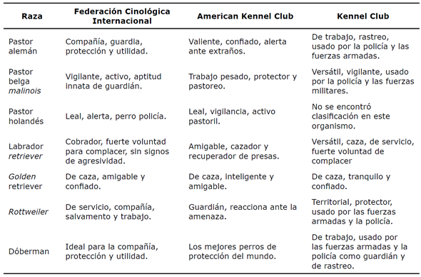 Tabla 1 Características de las razas según nomenclatura de organizaciones caninas internacionales