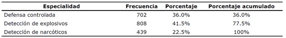 En relación con la especialidad en la que se encuentran prestando labores, de los 1949 perros certificados, 808 caninos (41.5%) se encuentran cumpliendo labores en detección de explosivos, seguidos por 702 (36%) en labores de defensa controlada, y el 22.5% restante (439) en detección de narcóticos (véase Tabla 2).