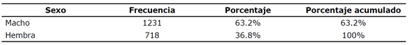 Respecto al sexo, de los 1949 perros certificados, 1231 caninos (63.2%) son machos, mientras que el 36.8% restante (718) son hembras (véase Tabla 3).