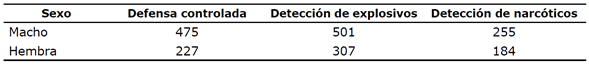 En cuanto a la actividad en la que se desempeñan y según el sexo de los animales, 501 machos se destinaron al trabajo de detección de explosivos, mientras que para esa misma actividad se asignaron 307 hembras; para la actividad de defensa controlada se destinaron 475 machos y 227 hembras, y para la detección de narcóticos, 255 machos y 184 hembras (véase Tabla 4).