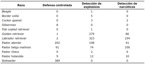 En relación con el comportamiento de la variable raza y la especialidad, de los 1949 perros caracterizados, 389 canes de raza rottweiler se destinaron a la defensa controlada, mientras que 323 labrador retriever a la detección de explosivos; 279 golden retriever se eligieron para la detección de explosivos, mientras que 202 pastores alemanes a la defensa controlada; seguidos por 194 labradores retriever entrenados en la detección de narcóticos, y 108 pastores alemanes destinados a la detección de narcóticos. Por otra parte, 100 pastores belgas malinois asignados a la detección de narcóticos, 91 a la defensa controlada y 74 a la detección de explosivos. Igualmente, en menores cantidades se destinaron a estas actividades (véase Tabla 5).