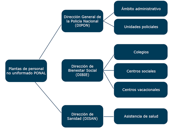 Hoy en día, la Policía Nacional tiene tres plantas de personal no uniformado: la Dirección General de la Policía Nacional (DIPON), la Dirección de Bienestar Social y Familia (DIBIE) y la Dirección de Sanidad (DISAN) (véase Figura 1). Estas hacen referencia a la cantidad de funcionarios por cada empleo, autorizados por el Gobierno Nacional mediante decreto, y que dependen de la disponibilidad presupuestal y de las necesidades de la Institución (Policía Nacional de Colombia, 2023).