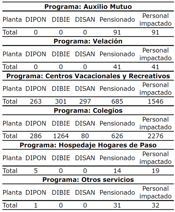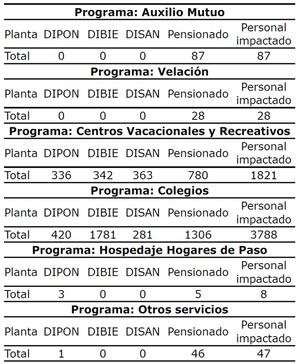 Así las cosas, respecto al programa “colegios”, a la DIBIE le fue asignado el 56% del beneficio, en tanto que a la DIPON el 13% y a la DISAN el 4%. De igual manera, frente al programa “hospedaje en Hogares Madre María San Luis”, a la DIPON se le otorgó el 26%, mientras que a la DIBIE y a la DISAN el 0%. Y en lo atinente a “otros servicios”, la DIPON se beneficiaría del 3%, pero tanto la DISAN como la DIBIE de un 0%. No obstante, y como se evidencia en el 2018, el margen diferencial respecto del programa “centros vacacionales y recreativos” no fue tan amplio, pues a la DIPON se le asignó 17%, a la DIBIE 20% y a la DISAN 19%.
