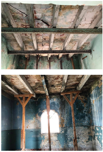 Son evidentes la presencia de humedad en la losa de entortado y el flechamiento de las vigas de madera.
