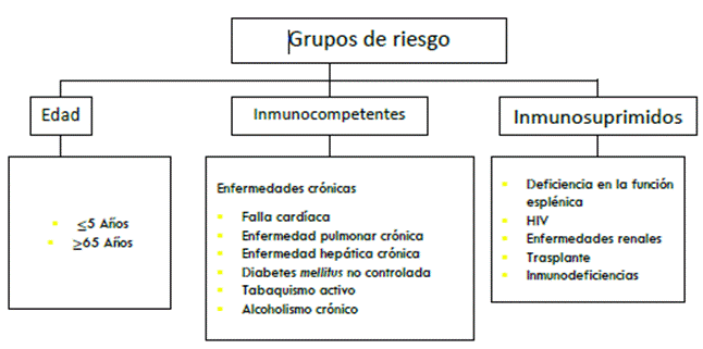 Dentro de los principales factores de riesgo para enfermedad neumocócica invasiva (figura 2) se incluyen adultos mayores, pacientes con enfermedades crónicas (enfermedad cardiovascular, enfermedades pulmonares crónicas, enfermedad renal crónica (ERC) y diabetes mellitus no controlada), fumadores, esplenectomizados, inmunosuprimidos y con neoplasias hematológicas malignas 11-16. Otros factores de riesgo descritos incluyen fistula de líquido cefalorraquídeo y usuarios de implantes cocleares 17-20.