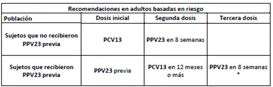 Para los pacientes que han recibido inmunización previamente con la vacuna PPSV23, las recomendaciones dictan esperar al menos 1 año posterior a esta inmunización para administrar una dosis de la vacuna PCV13 Tabla(2)50.