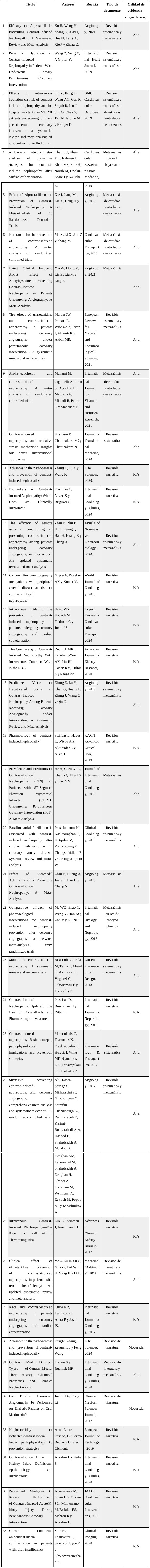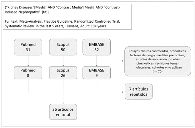 Se realizó una validación de las revisiones obtenidas en diferentes bases de búsqueda (anexo B), tales como PubMed, Scopus y Embase. Se utilizó como palabra clave principal o palabra incluida en el título: ("Kidney Diseases"[Mesh]) AND "Contrast Media"[Mesh] y se usaron como filtros: Full text, Meta-Analysis, Practice Guideline, Systematic Review, in the last 5 years, Humans, Adult: 19+ years. Para Scopus, Embase y Scielo se utilizó la siguiente estrategia de búsqueda: TITLE ( "Contrast-Induced Nephropathy" ) AND ( LIMIT-TO ( PUBYEAR, 2022 ) OR LIMIT- TO ( PUBYEAR , 2021 ) OR LIMIT-TO ( PUBYEAR , 2020 ) OR LIMIT-TO ( PUBYEAR , 2019 ) OR LIMIT-TO ( PUBYEAR , 2018 ) OR LIMIT-TO ( PUBYEAR , 2017 ) OR LIMIT- TO ( PUBYEAR , 2016 ) OR LIMIT-TO ( PUBYEAR , 2015 ) OR LIMIT-TO ( PUBYEAR , 2014 ) OR LIMIT-TO ( PUBYEAR, 2013 ) ) AND ( LIMIT-TO ( DOCTYPE , "review article" )OR DOCTYPE "Research article" OR DOCTYPE("Practice guidelines").