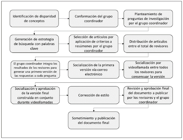 Los 36 artículos fueron distribuidos entre 8 revisores. Se identificaron 4 artículos con relevancia temática que fueron evaluados por todos los revisores, los 32 artículos restantes fueron distribuidos al azar. Una vez se contó con el total de respuestas, el comité coordinador las unificó y realizó una síntesis narrativa, la cual fue presentada inicialmente vía correo electrónico a todos los revisores y, posteriormente, se hicieron reuniones por medio de videollamadas para correcciones y revisiones al documento. Una vez se contó con el aval del total de especialistas, se realizó una versión que fue sometida a corrección gramatical y de estilo, para posteriormente ser revisada por los participantes del consenso y, luego de tener en cuenta las observaciones de los participantes, se realizó la revisión final del documento (figura 2) (anexo D).