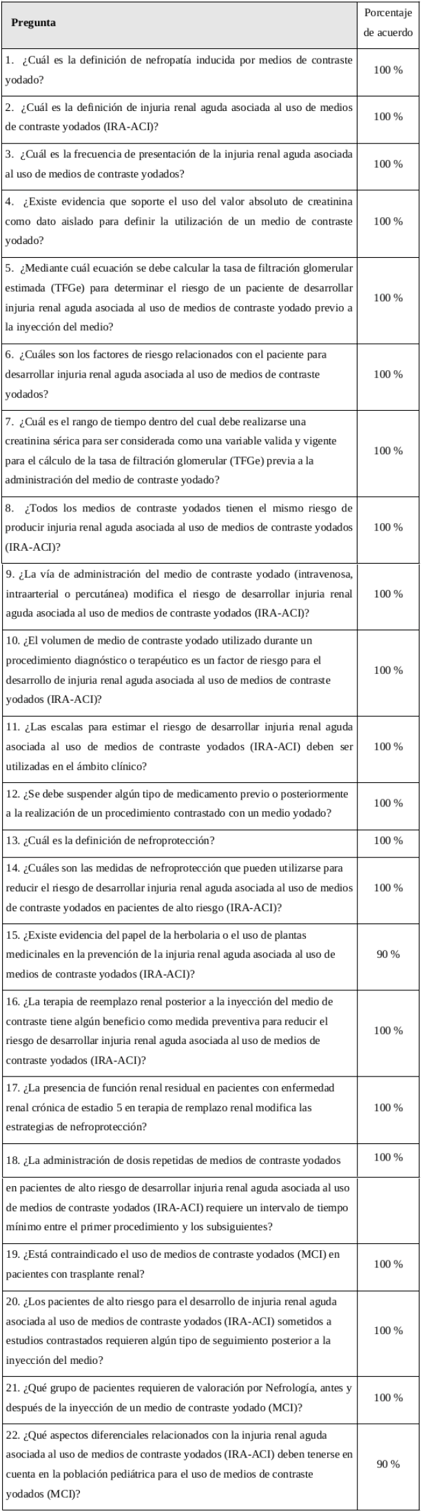 Se elaboraron preguntas de interés por el grupo coordinador conformado por el presidente de la Asocolnef, el presidente de la ACR, un nefrólogo-epidemiólogo y dos metodólogos (epidemiólogos clínicos). Se convocaron 10 especialistas (5 nefrólogos, 4 radiólogos y 1 nefrólogo pediatra), teniendo en cuenta su experiencia clínica y su trayectoria académica y, finalmente, 9 especialistas (4 nefrólogos, 4 radiólogos y 1 nefrólogo pediatra) respondieron al llamado y culminaron el proceso de revisión. Se procuró una participación de las diferentes regiones de Colombia: Eje Cafetero, Oriental, Caribe, Pacífico y Centro. Todos los participantes manifestaron no tener conflictos de interés.