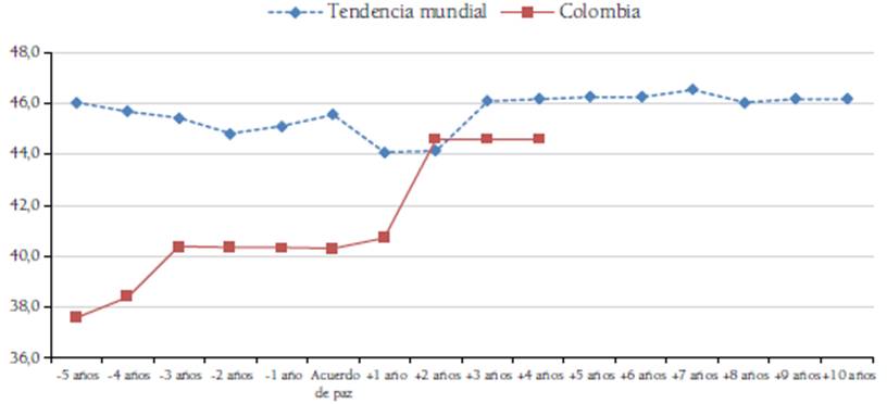 En este aspecto, Colombia mantiene el mismo grado que se tenía antes de la firma del acuerdo de paz (Figura 9), muy por encima de la tendencia mundial en países en la misma situación. Esto no significa que la cultura política y la fortaleza de las instituciones democráticas sean ideales en el país, pero demuestra que, a pesar de las innumerables dificultades a las que se han enfrentado los Gobiernos nacionales y los ciudadanos, Colombia mantiene condiciones favorables para que las decisiones sobre el destino del país se debatan en forma abierta y exista la posibilidad de la autodeterminación de los pueblos.