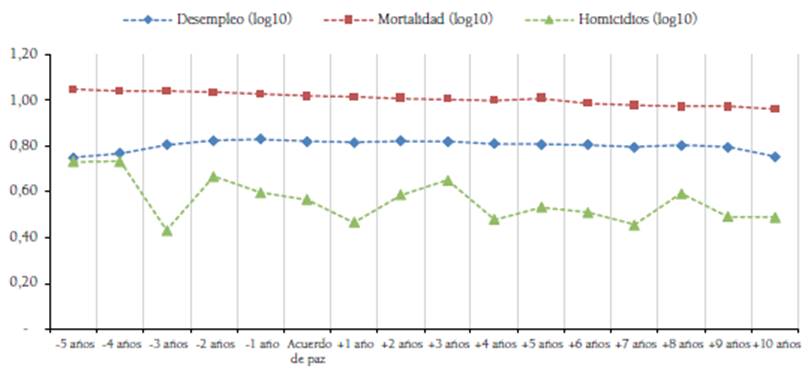Figura 10: Evolución de indicadores desfavorables en la implementación del Acuerdo de paz (en log10)