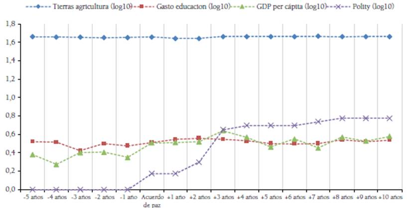 Luego se procedió a determinar nueve aspectos comunes en los acuerdos de paz tendientes a mitigar el crimen organizado, proteger los DD. HH. de los ciudadanos y acercarse a un ambiente de reconciliación. Dichos aspectos fueron: 1) uso de tierras para agricultura; 2) gasto en educación; 3) desempleo; 4) tasa de mortalidad por causas naturales; 5) homicidios intencionales; 6) inversión en seguridad y defensa; 7) inversión en el sector público; 8) producto interno bruto (GDP), y 9) fortaleza de la democracia.