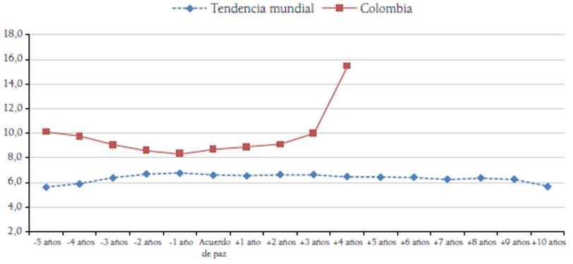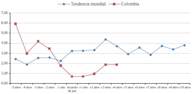 Todos los anteriores indicadores inciden directamente en el desarrollo de la economía y en el crecimiento del producto interno bruto (GDP) per cápita; sin embargo, Colombia aún no se encuentra a la par de la tendencia mundial. En efecto, aunque desde la firma del acuerdo de paz la política pública surgida a raíz de su implementación ha impactado positivamente en el GDP per cápita, con un crecimiento anual del 1,8 %, los países que han sufrido conflictos armados internos han tenido en el mismo periodo un ascenso entre 3,3 % y 4,3 % anual (Figura 8).