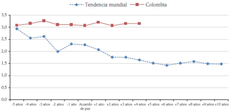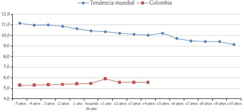 La muerte de ciudadanos, excepto las muertes violentas, es tal vez una de las cifras más dicientes en un escenario de implementación de un acuerdo de paz, toda vez que permite identificar la continuidad de decesos por fallas en la asistencia alimentaria, los servicios de salud y políticas de prevención (Figura 4). En este aspecto, aunque Colombia se mantiene por debajo de la tendencia mundial de países que han sido afectados por conflictos armados internos, no ha avanzado en la reducción efectiva del 5,5 % de ciudadanos por cada 1000 habitantes que mueren anualmente por falta de cubrimiento sanitario.
