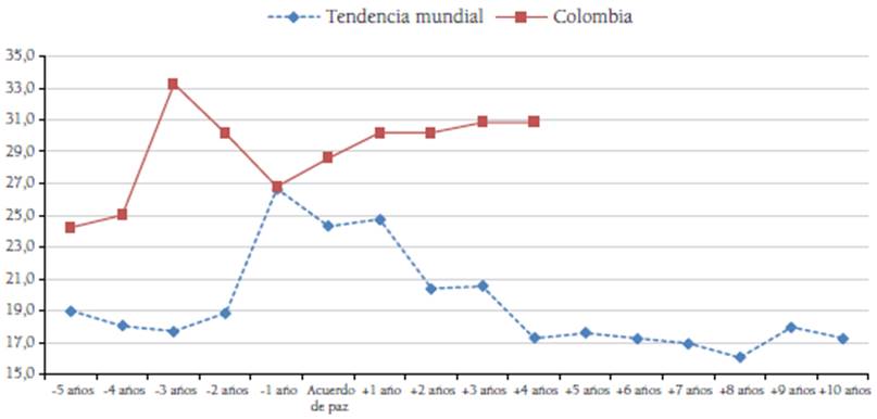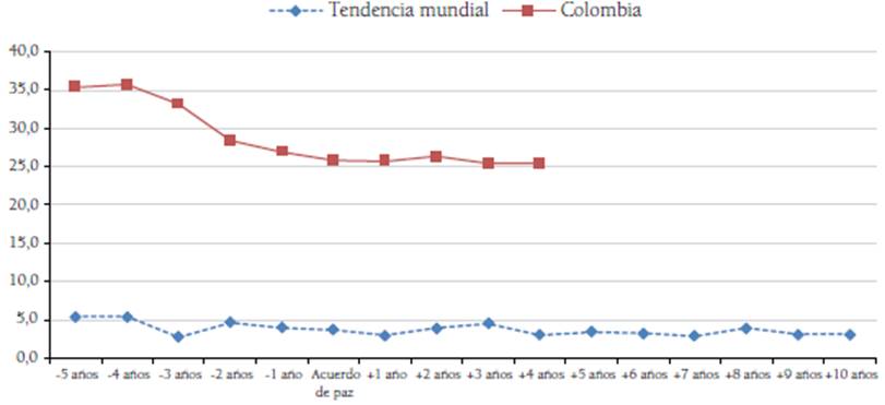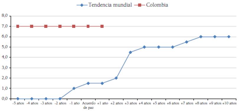 A continuación, se emplearon los datos del Banco Mundial, con corte a diciembre de 2020, para detectar la evolución de los nueve aspectos en un período que abarca desde cinco años antes de la firma del acuerdo de paz hasta diez años después de su implementación. Con los datos obtenidos se definieron tendencias comparativas con el caso colombiano, que permiten caracterizar el avance de la política pública nacional en la erradicación del crimen organizado, la protección de los DD. HH. y la búsqueda de la reconciliación.