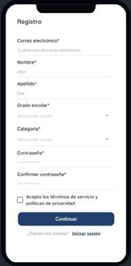 Para registrarse en el APP, se debe hacer clic en Crea una cuenta nueva, ingresar los datos requeridos, aceptar los términos y condiciones y hacer clic en Continuar.