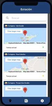 Después de terminar el tutorial o iniciar sesión (para usuarios registrados), el APP se redirige a la pantalla de estaciones, que tienen el respectivo nombre y la ubicación. Si se prefiere, se puede hallar una estación específica mediante el campo de búsqueda.