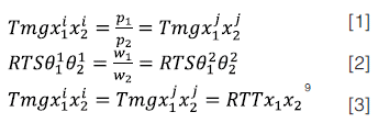 Donde la igualdad [1] representa la eficiencia en el consumo que se refiere a la igualdad de las dos tasas marginales de sustitución del individuo i y j, mediadas por la relación de precios, lo que significa que el intercambio se realiza donde la utilidad marginal de cada bien es igual a su precio, lo que se cumple para los dos consumidores. La igualdad [2] implica que para los dos productores se cumple que la productividad marginal de sus factores es igual a su precio.