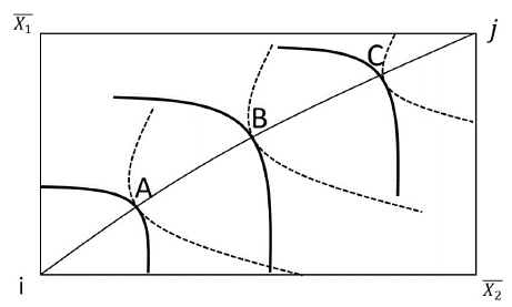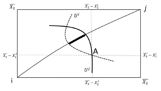 El gráfico 1 muestra el esquema básico del intercambio de dos consumidores en el modelo de equilibrio general. La curva que une a (i) con (j) es la curva del contrato, lugar geométrico donde los dos consumidores igualan sus tasas marginales de sustitución, por lo que en toda esta curva el intercambio es eficiente. Sin embargo, el punto A, que se corresponde con la dotación inicial de recursos, es una situación no óptima para los individuos (i) y (j)