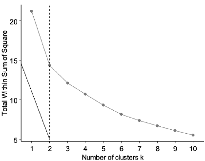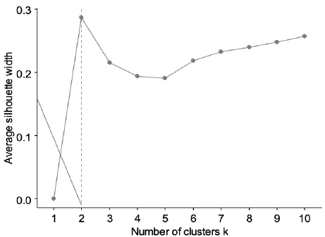Para evitar la elección de la cantidad óptima de clústeres sólo con base en el dendrograma, se implementaron dos de las reglas más simples y comúnmente utilizadas, en función de los criterios de compacidad interna de cada clúster y separación entre clústeres2. Por esta razón, tanto el método de heterogeneidad del "codo" como el de la "silueta"3, indican que la agrupación en dos clústeres de empresas representa el número óptimo para aglomerar las empresas (ver figuras A1 y A2 del anexo).