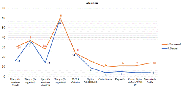 Durante la evaluación, se evidenció que B tiene capacidades básicas para sostener su atención durante una tarea y seleccionar estímulos con el fin de cumplir una meta, con fallas en la alternancia atencional que dificultan procesos de atención compleja y mantenimiento de foco ante tareas que le implican mayor esfuerzo cognitivo. Presenta deficiencias en la velocidad de procesamiento que comprometen su capacidad para focalizar, explorar y ordenar con rapidez y eficacia (ver Figura 3).