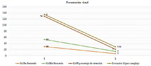La paciente muestra pocas capacidades básicas de registro, almacenamiento y evocación de la información con fallas en el sistema de retención y almacenamiento de estímulos auditivos y visuales de la memoria inmediata. Presenta dificultad variable para coordinar, de manera simultánea, varias actividades que requieran la manipulación de la información, específicamente en la transformación de la información visual a la verbal, con afectaciones significativas en lo que concierne a la memoria operativa. Frente a tareas de reconocimiento no hay un beneficio significativo. Aunque existe un grado de variabilidad en el desempeño de las pruebas, se observa que a la paciente se le facilita más el proceso de aprendizaje y memoria visual con apoyo de tareas de ejecución (ver Figura 4 y 5).