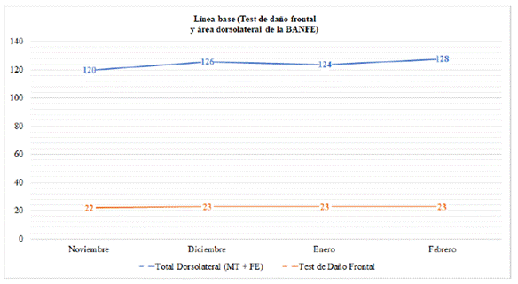 Se realizó una medición de las tareas del área dorsolateral de la batería BANFE con el fin de valorar, a profundidad, el desempeño de B ante actividades que requieren planeación, abstracción, memoria de trabajo, seriación, secuenciación y flexibilidad mental. Asimismo, se utilizó el cuestionario neuropsicológico de daño frontal de la misma batería (aplicado a la docente de B). Los resultados obtenidos en cuatro momentos diferentes permitieron conocer cómo la red de apoyo de la paciente percibe su grado de autoconciencia, sus intereses, motivaciones, el control conductual, su personalidad, entre otras variables que inciden en su funcionamiento. Como resultado de las cuatro mediciones, se obtuvo en ambas pruebas un patrón de respuesta y conducta estable, con un puntaje natural mínimo de 120 y puntaje natural máximo de 128 para las tareas del área dorsolateral, que indican que B presenta severas dificultades en el funcionamiento de dicha área (ver Figura 8).