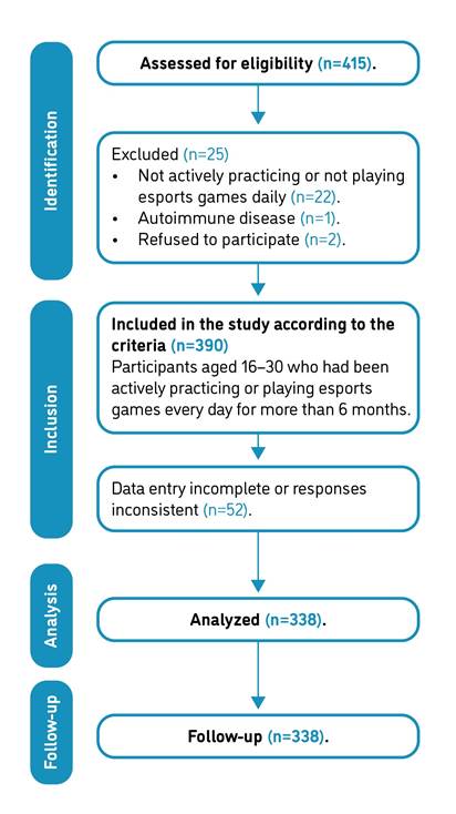 The research population consisted of esports enthusiasts in Indonesia. Since the population size was unknown, the sample size was calculated using the Lemeshow formula, with a 5% margin of error and a proportion of 31.3% [32], which represents the most commonly reported site of musculoskeletal pain -the back region- among esports athletes. As a result, a minimum sample of 329 respondents was obtained. The forms were distributed in eight provinces: Central Java, East Java, West Java, North Borneo, East Borneo, Bengkulu, Jambi, and Lampung. A total of 415 esports players were willing to fill out the research questionnaire. After data screening, 338 respondents who fit the inclusion criteria were included. Inclusion Criteria: 1) 16-30 years old; 2) male and female gender; 3) status as an esports enthusiast, defined as an individual actively engaged in competitive gaming activities, whether recreationally or in formal tournaments, across various levels of participation (amateur, semi-professional, professional) and platforms (mobile, computer, or console); 4) actively practicing or playing video games every day for more than six months; 5) and willing to be a respondent. Exclusion Criteria: 1) have a history of previous musculoskeletal injuries such as scoliosis, herniated nucleus pulposus, entrapment of vertebral nerves, and fractures of fingers, wrist, hand, elbow, shoulder, or back within the past six months; 2) medical disorders such as neurological disorders and autoimmune diseases.