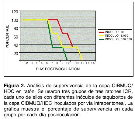 Experimentos de virulencia, determinación de la dosis letal 100 y prueba de estabilidad de la virulencia: se utilizaron tres grupos de ratones ICR cada uno con tres individuos. Cada grupo fue inoculado por vía intraperitoneal con una cantidad diferente de parásitos: 10, 1.000 y 500.000 taquizoítos, respectivamente, para determinar la virulencia del aislamiento; se determinó el porcentaje de mortalidad y el tiempo de supervivencia para cada grupo. Posteriormente, se examinó el rendimiento y el factor de crecimiento en pases sucesivos en ratón.