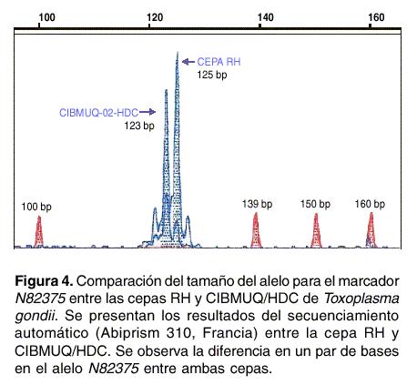 Para descartar una posible contaminación o cruce entre la cepa de referencia RH que se mantiene en el laboratorio del Centro de Investigaciones Biomédicas y el aislado, se compararon los microsatélites de ambas cepas y se confirmó que es una cepa diferente a la RH del laboratorio pues su genotipo mostró una diferencia en el tamaño del alelo de dos pares de bases para el marcador N82375 (
