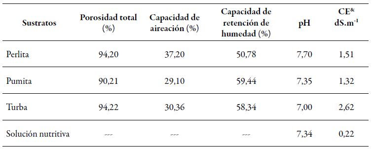 La selección de sustrato se realizó en función del sustrato ideal que planteó Cabrera (1999), quien indicó que el sustrato ideal debe tener mínimo 70 % de porosidad total, 50 % de capacidad de retención de humedad y 20 % de aireación.
