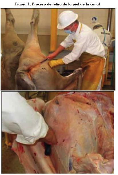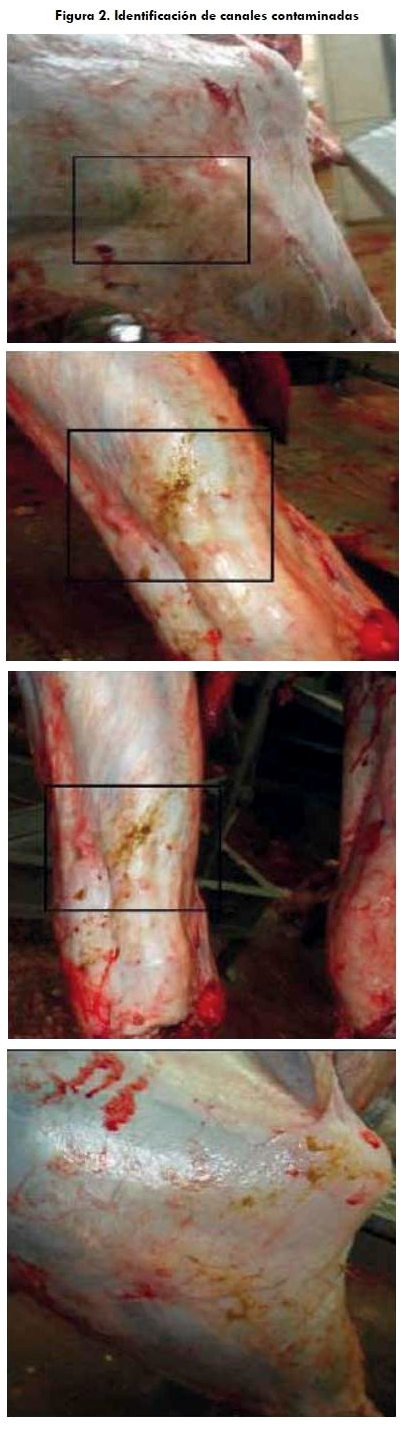 La contaminación de canales es altamente variable en extensión y lugar. La mayoría ocurre inmediatamente después del retiro de la piel en la superficie externa de la canal (figura 1), pero la parte interna del músculo permanece esencialmente estéril (2). La contaminación superficial es originada por la piel del animal, ya que la canal se expone al pelo acumulado con polvo, mugre y materia fecal (3). Otras fuentes son contenido gastrointestinal, equipos, personal, utensilios y ambiente de trabajo (agua y aire) (4), teniendo como consecuencia la necesidad de implementar procedimientos higiénicos efectivos dentro de las plantas de beneficio durante la faena (2).