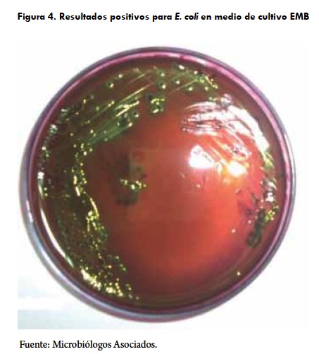 Para Salmonella spp., de las 26 muestras antes de ser aplicado cualquiera de los 3 desinfectantes, no se obtuvieron resultados positivos, por lo que no fue posible determinar la eficiencia de desinfección. Los resultados de E. coli mostraron colonias en el medio EMB de centro grande, de color oscuro y verdes brillantes (figura 4).