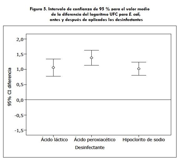 Dentro de los estudios que demuestran la eficacia de estos desinfectantes, Castelo (16) comprueba, con cortes de cerdo, la efectividad del ácido láctico al 2% durante 75 segundos a una temperatura de 15 °C, disminuyendo las UFC de E. coli a niveles bajos de 0,11 UFC log. Castillo y cols. (15) y Hardin y cols. (17) comprueban que el ácido láctico al 2% en carcasas bovinas reduce coliformes totales y E. coli a niveles aceptables; sin embargo, en este estudio se obtuvieron los mismos resultados utilizando una concentración baja, ayudando a minimizar los cambios sobre la canal y el consumo del producto por litro, y reduciendo costos.
