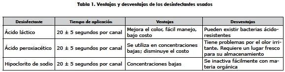 Durante la fase experimental se manejaron el ácido láctico, el ácido peroxiacético y el hipoclorito de sodio. En la tabla 1 se resumen las ventajas y desventajas que tienen estos desinfectantes. La ventaja que se destaca para los tres es la facilidad de aplicación por medio de la aspersión sobre la canal; como desventaja general está la falta de capacitación de los trabajadores en cuanto a las Buenas Prácticas de Manufactura (BPM).