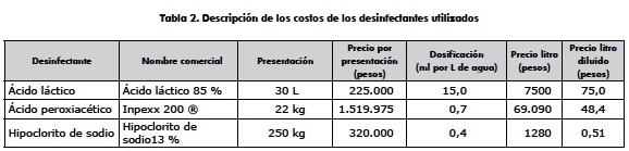 En la tabla 2 se muestra el análisis de costos de los productos utilizados en este estudio. El hipoclorito de sodio es el que presenta menor costo por su baja dilución y precio de presentación; el ácido láctico es el segundo menor costo, con treinta pesos por litro. El ácido peroxiacético es el más costoso, pero no significa que no sea viable económicamente, ya que 48,4 pesos por litro no es un precio alto para un desinfectante efectivo.