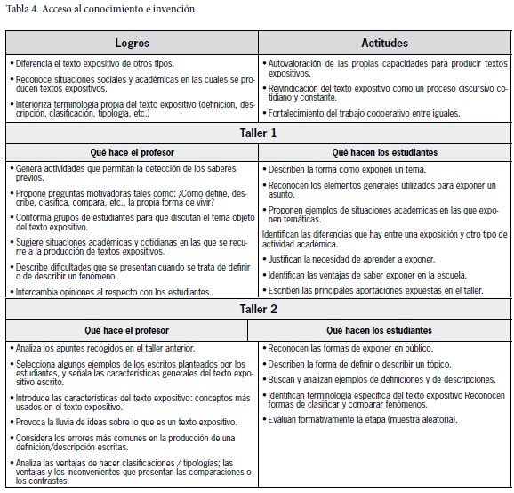 En este momento el estudiante, con ayuda del profesor, identifica los saberes previos y las experiencias académicas y cotidianas sobre la construcción de textos expositivos, y diferencia este tipo de texto de otros (tabla 4).