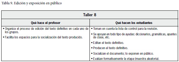 Se produce el texto definitivo. Los estudiantes toman conciencia de las etapas textuales trabajadas y de la perfectibilidad del texto escrito. Una vez más, asumen la lista de control (tabla 8) trabajada en la fase anterior con el objeto de precisar aspectos puntuales, determinados a lo largo de la secuencia didáctica (tablas 7 y 9), especialmente asumen las marcas textuales reseñadas más arriba. Dicho de otra manera, con algunas pautas, regulan el proceso de aprendizaje de la escritura de textos expositivos (Camps, 1998).