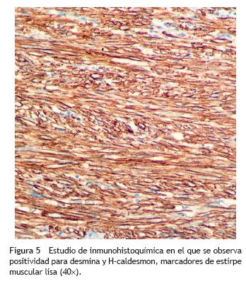 En el estudio patológico, en la macroscopía (fig. 3), se recibió un tumor sólido gris homogéneo de 10 x 7 cm; dicho tumor se encontraba adherido a la vena cava provocando protrusión endoluminal. En el estudio microscópico se observó un sarcoma fusocelular con áreas hipercelulares con atipia, mitosis y necrosis (fig. 4). El estudio de inmunohistoquímica (fig. 5) fue positivo para desmina, Hcaldesmón, AML y CD99 con Ki67 de 60% y negatividad para miogenina, DOG1, CD57, CD31, mioglobina, CD34, CD117 y EMA. La creatitina (AE1/AE3) y el S100 fueron positivos focales4. El diagnóstico definitivo fue leiomiosarcoma grado III, con márgenes libres de tumor.