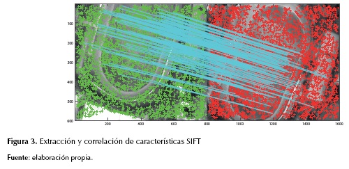 Una vez han sido extraídas las características de interés, el siguiente paso consiste en la correlación de características o correspondencia de puntos característicos (figura 3), que compara los vectores descriptores extraídos. Para ello se presentan dos métodos ampliamente utilizados: la búsqueda cuadrática (más lento pero riguroso, ya que realiza todas las combinaciones posibles en la comparación de los puntos) y la estructura de datos kd-tree (más rápido pero aproximado, debido a que la descomposición del espacio de datos disminuye la cardinalidad de los puntos a medida que se avanza en el árbol) (Arya et al., 1998; Barazzetti, Remondino y Scaioni, 2010b).