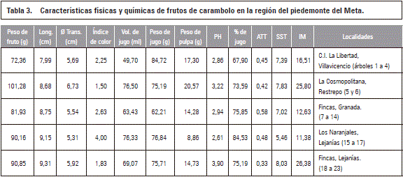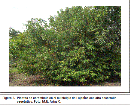 Para reconocer el comportamiento vegetativo del carambolo en condiciones de trópico húmedo se visitaron algunas fincas en tres zonas representativas de los suelos y condiciones climáticas del piedemonte del Meta (terrazas altas del piedemonte-Villavicencio, vegas del Ariari-Granada y Lejanías, y finalmente Restrepo), donde se tomaron las medidas de: altura de planta, copa y diámetro para determinar el volumen de copa. Aunque no todas las plantas tenían la misma edad, los valores se promediaron para obtener una imagen del comportamiento general de esta especie en condiciones locales.