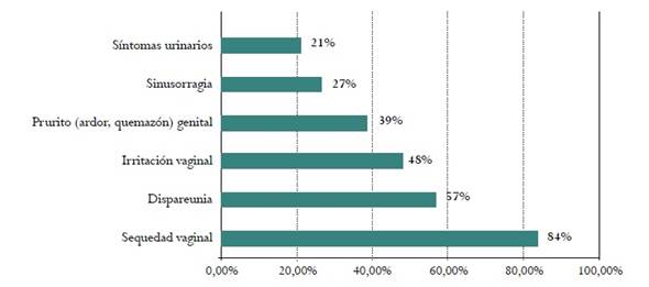 En relación con la sequedad vaginal como el síntoma más frecuente, nuestros resultados sobrepasan lo reportado en otros estudios, como el realizado por Chua et al. en Asia que informan una frecuencia de 57 % 19, y otros que muestran una frecuencia de 27 a 55 %, realizados en poblaciones similares20-23.