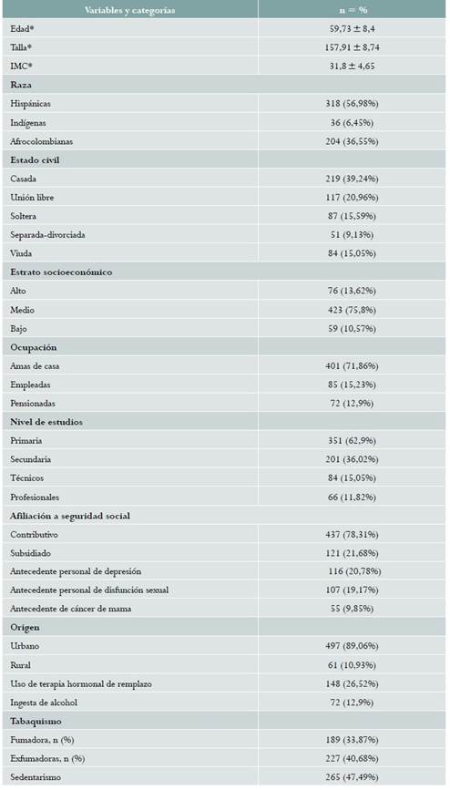 La edad media de las mujeres incluidas fue de 59,73 (DS ± 8,4), el IMC fue de 31,8 (DE ± 4,65), eran mayoritariamente mestizas, amas de casa, tenían unión estable, bajo nivel de escolaridad y pertenecientes al régimen de aseguramiento contributivo. La edad de inicio de la menopausia fue de 48,1 (DS ± 5,39), con una duración media de la menopausia de 9,6 (DS ± 7,5) (tabla 1). El 27,41 % (153) refirió más de 20 años de convivencia en pareja. La práctica sexual más frecuente fue el coito vaginal (100 %), y la menos frecuente el coito anal (8,42 %); la masturbación es considerada una práctica poco común (5,73 %) en las mujeres encuestadas. El 87,63 % (489) afirmó disfrutar que le practicaran sexo oral. A la pregunta ¿cuántas veces tuvo relaciones sexuales el mes pasado? (periodo definido como el lapso de los treinta días anteriores), el 38,53% (215) contestó afirmativamente, con una mediana de 3 relaciones sexuales por mes (rango entre 0 y 6). El 96,23% (537) de las mujeres manifestó que su pareja presentaba alguna disfunción sexual. El 15,05 % (84) informó haber sufrido alguna forma de violencia sexual a lo largo de la vida, mientras que el 19,35% (108) reportó violencia o abuso sexual por parte de la pareja, luego del inicio de la menopausia, secundario a la negativa de acceder voluntariamente a la actividad sexual.