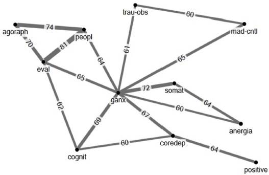 In the network graphic, three closelycorrelated syndromes can be observed: "agoraphobia", "fear of people" and "fear of evaluation", the last two corresponding to the concept of social phobia. Comorbidity studies also show a strong association between social anxiety and agoraphobia.6,38 By the same token, agoraphobia and social phobia belong to the so-called fear/phobic disorders.4,39 Finally, distress and phobias are found within the internalization disorders group.4,39