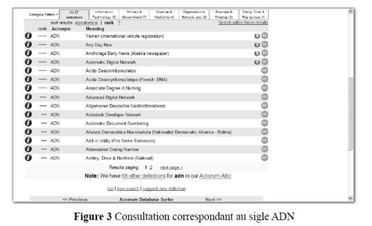 4.2.1 Description Les éditeurs d'Acronym Finder le considèrent comme un outil créé seulement pour chercher et présenter les formes développées des abrégements. Cette ressource offre sa propre définition et sa propre classification des abrégements : ''What's an Acronym?: An acronym is a pronounceable word formed from each of the first letters of a descriptive phrase or by combining the initial letters or parts of words from the phrase. Here are some examples of acronyms: North Atlantic Treaty Organization = NATO MODulator/DEModulator = MODEM An acronym is actually a type of abbreviation. Our database contains abbreviations, acronyms, and initialisms and we make no distinction between them in our database or on our site. We are more interested in defining ''acronyms'' for you than we are in trying to properly distinguish between abbreviations, acronyms, and initialisms. Though you sometimes see acronyms or abbreviations written with periods after each letter (e.g., U.S.A.), we don't use that form here. When entering search terms, don't include the periods (unless the acronym normally contains a period, i.e., X.25).''12 L'interface utilisateurs présente dans sa partie supérieure un formulaire d'interrogation d'où l'on peut consulter : 1.la forme développée d'un abrégement, 2.un mot qui se trouve dans la forme développée d'un abrégement. Dans la partie inférieure, l'interface présente six catégories (Information & Technology, Military & Government, Business & Finance, Science & Medicine, Organizations & Schools, et Slang & Pop Culture) où sont classés tous les abrégements recueillis dans le dictionnaire. De plus, on y trouve plusieurs liens, parmi lesquels nous mentionnons les plus importants: About (information générale sur Acronym Finder) Suggest an Acronym (formulaire pour l'envoi d'abrégements) Contributors (liste des personnes qui ont proposé plus de 50 abrégements au dictionnaire) Statistics (données sur la quantité de visites sur le site, le nombre actuel d'abrégements dans le dictionnaire, etc.) AF Blog (un blog où l'on présente les dernières nouvelles sur Acronym Finder). L'aspect actuel de l'interface utilisateurs d'AF est le suivant (voir Figure 2): En plus de l'hyperstructure, les deux composants les plus importants pour l'analyse des dictionnaires sont la macrostructure et la microstructure. On définit la macrostructure comme l'analyse de trois éléments : 1) l'ensemble d'entrées qui forment la nomenclature du dictionnaire; 2) la façon de représenter les entrées ; 3) l'ordre de représentation. La microstructure est l'ensemble des indications organisées dans les articles lexicographiques. Elles sont des marques explicites transmettant un type déterminé de donnée (voir Tableau 2). Pour la recherche de la forme développée (désormais FD) d'ADN l'interface renvoie les résultats sur plusieurs lignes : Sur la première ligne apparaissent les Category Filters: (Information & Technology, Military & Government, Science & Medicine, Organizations, Business & Finance et Slang, Chat & Pop culture). Sur la deuxième ligne apparaissent les options d'organisation des résultats : par ordre alphabétique ou par rang d'importance. Les résultants, c'est–à–dire toutes les formes développées recueillies correspondant au sigle ADN, apparaissent sur la troisième ligne. Chaque résultat est précédé de l'icône '' i '' qui veut dire '' More information & Searches '', ainsi que d'un certain nombre d'astérisques qui représentent le rang ou l'importance de l'abrégement. Ensuite, on trouve le sigle consulté, dans notre cas, le sigle ADN, suivi de sa forme développée. Puis, apparaît l'icône du livre qui signifie que l'utilisateur peut rechercher plus d'informations sur '' Freedictionary.com '' et, enfin, apparaît le lien '' Go '' qui mène vers '' Amazon '', la librairie sur Internet (ce qui facilite la recherche des livres qui ont un lien avec l'abrégement consulté). En outre, il existe une option pour chercher un sigle grâce à ''Acronym Database Surfer'', dont la fonction est de montrer tous les abrégements qui précèdent et qui suivent ADN, dans l'ordre alphabétique. La copie d'écran suivante est le résultat de la consultation correspondant au sigle ADN (voir Figure 3): Les phénomènes d'abrégement (et particulièrement la siglaison) intéressent des domaines tels que la linguistique, la néologie, la traduction, la lexicologie, la terminologie, la rédaction technique, les langues de spécialité (LSP), ou la linguistique computationelle. Chaque domaine d'activité produit ses propres abrégements. C'est pourquoi des ressources on line et sur papier telles que des dictionnaires, glossaires ou bases de données tant générales que spécialisées font constamment leur apparition, pour recueillir et décrier ce type d'unités. En ce qui concerne la qualité d'AF comme ressource on line, on peut dire que sur les dix critères évalués, sept sont accomplis et qu'il reste seulement à améliorer les critères d'originalité, les liens vers d'autres ressources et la précision. Acronym Finder est la plus grande ressource d'abrégements on line qui existe actuellement. Néanmoins de la même façon que pour les autres ressources on line mentionnées tout au long de ce travail, AF se préoccupe de recueillir le plus grand nombre d'unités, mais laisse de côté une grande quantité d'informations complémentaires sur les abrégements, qui pourraient être de grande utilité pour le profil d'utilisateurs qui les consultent tous les jours. En particulier, il devrait au moins inclure les catégories de données suivantes : catégorie grammaticale, contexte, source, équivalent (s) dans d'autres langues et domaine de provenance des abrégements. De tout ce qui vient d'être dit, on déduit que ces ressources, malgré le fait qu'elles accomplissent la fonction de dictionnaires on line, ne sont pas créées sur la base de critères vrai
